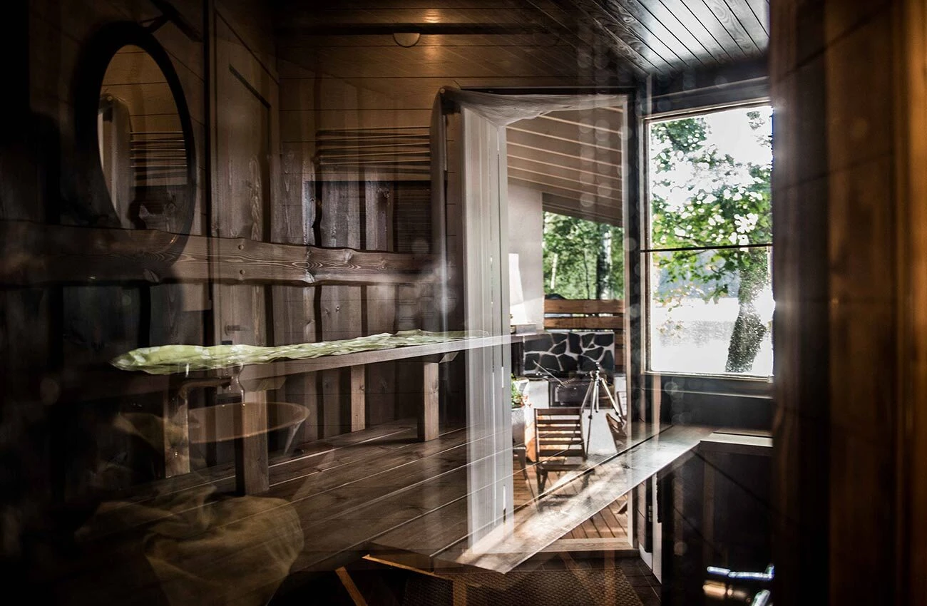 Paratiisin sauna lämpiää puulla ja sen ylälauteille mahtuu 7 henkilöä, saunatiloissa on 2 suihkua, WC sekä pukuhuone. Tummasävyisen saunan seinät ovat tuppeensahattua mäntyä ja lauteet lähimetsän haapaa. Saunan suuresta ikkunasta voit ihailla järvimaisemaa ja saunasta pääset sujuvasti terassille vilvoittelemaan ja uimaan.
