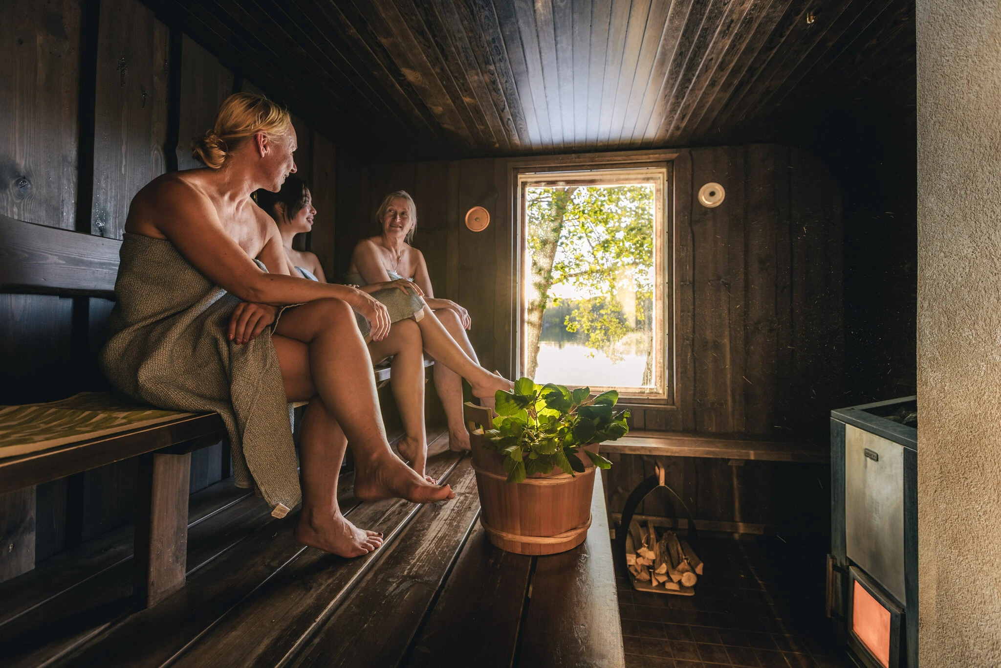 Sauna lämpiää puulla ja sen ylälauteille mahtuu 6-7 henkilöä, saunatiloissa on 2 suihkua, WC sekä pukuhuone. Saunan suuresta ikkunasta voit ihailla järvimaisemaa, tummasävyisen saunan seinät ovat tuppeensahattua mäntyä ja lauteet lähimetsän haapaa.